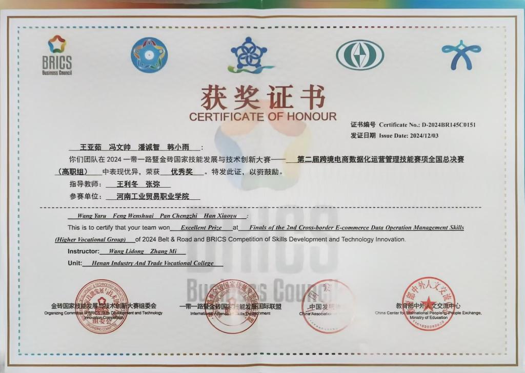 河南工业贸易职业学院经济贸易学院的师生们展现了卓越的实力和才华。在这场汇聚了全国精英的大赛中,王利冬和张弥两位教师指导的学生冯文帅、韩小雨、潘诚智、王亚如在此次比赛中表现出色,凭借扎实的专业知识、精湛的技能操作以及出色的团队协作能力,获得优秀奖。