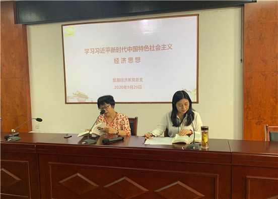 贸易经济系副主任张素勤围绕《习近平谈治国理政》第三卷第九专题“推动经济高质量发展”部分,通过读原文的形式带大家认真学习了第一篇《长期坚持、不断丰富发展新时代中国特色社会主义经济思想》、第二篇《我国经济已由高速增长阶段转向高质量发展阶段 》和第三篇《加快建设现代化经济体系》的主要内容。张素勤要求党员和老师要以读促学,坚持读原著、学原文、悟原理,领会精髓要义,把习近平新时代中国特色社会主义经济思想应用到教学工作实践中。
