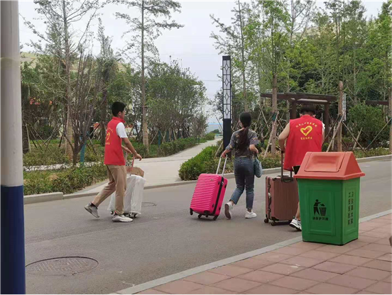 志愿者们满怀热情,顶着烈日为刚搬迁过来的同学们搬运行李、指引方向、看守物品。汗水很快浸透了他们的衣衫,但他们没有丝毫抱怨,不怕苦不怕累,一直坚持到全体学生的行李搬运完毕。
