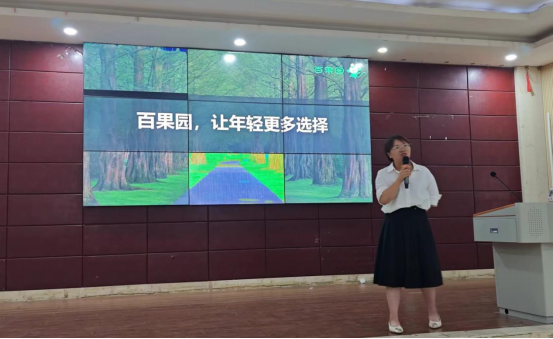 深圳百果园实业(集团)有限公司河南招聘负责人王春杰通过播放视频及PPT展示等形式,向在场的200余名学生全方位介绍了百果园的企业文化、技术创新、业务布局以及未来发展战略。此外,企业代表还详细解读了集团的人才理念、招聘岗位的具体要求、职业发展路径,以及为学生提供的专升本时薪伙伴、储备店长、实习生等不同职级全面成长的支持和福利体系,为同学们勾勒出一幅充满挑战与机遇的职业蓝图。