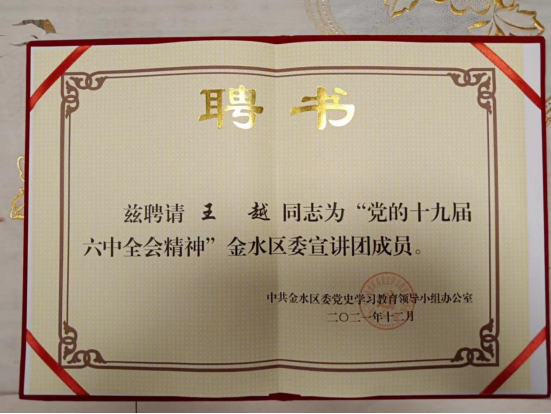 2021年是党史教育年,学校选派优秀教师参与金水区党史教育进社区、进学校、进基层宣讲活动工作。根据金水区宣传部的安排,学校马克思主义学院副院长王越被金水区宣传部聘为党的十九届六中全会金水区委宣讲团成员,多次到金水区大石桥街道管辖社区进行党的十九届六中全会精神宣讲,受到街道领导和群众的充分肯定,获得了良好效果。