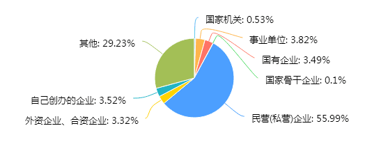 55.99%毕业生在民营(私营)企业工作。在国家机关事业单位及国有企业工作的占7.84%。