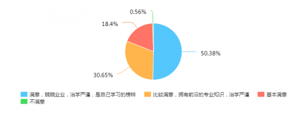 50.38%毕业生对学院师资满意,认为学院师资队伍兢兢业业、治学严谨,是自己学习的榜样。