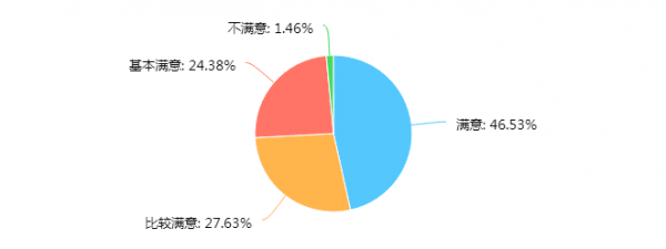 2016年毕业生对学院各项工作的总体满意度为46.53%,比较满意的占27.63%,,基本满意的占24.38,不满意的占1.46%.