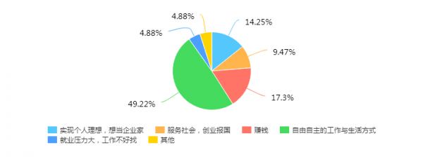 49.22%的毕业生表示创业的原因是喜欢自由自主的工作方式与生活方式;其次是为了赚钱占17.3%、实现个人理想想当企业家的占14.25%。
