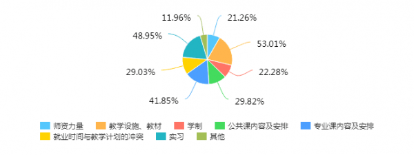 毕业生认为学院最值得研讨和改进的工作是教学设施、教材占53.01%。其次是实习48.95%、专业课内容及安排41.85%。