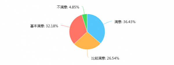 36.43%的毕业生对学院的就业工作表示满意,26.54%的毕业生比较满意, 32.18%的毕业生认为一般,4.85%的毕业生表示不满意。