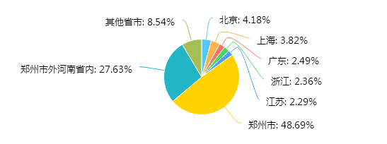 2016年毕业生在郑州市工作的占到了48.69%,较2015年下降了两个百分点。在北京、上海、广州、深圳工作学生比例为10.49%,郑州市外河南省内的为27.63%,其它省市8.54%。