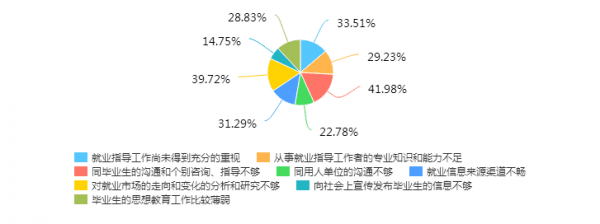 毕业生认为学院就业指导中存在的主要问题是同毕业生的沟通和个别咨询、指导不够。其次是对就业市场的走向和变化的分析和研究不够、就业信息来源渠道不畅。