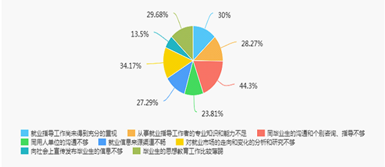 毕业生认为学院就业指导中存在的主要问题是同毕业生的沟通和个别咨询、指导不够。其次是对就业市场的走向和变化的分析和研究不够、就业信息来源渠道不畅。