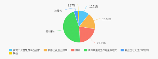 近半数毕业生表示愿意创业的原因是喜欢自由自主的工作与生活方式,其次是为了赚钱、服务社会创业报国。
