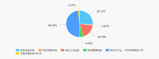 48.43%的毕业生认为创业中最大的困境是创业动机盲目,缺乏对行业、对市场足够的认知,其次是缺乏资金支持及工作经验。