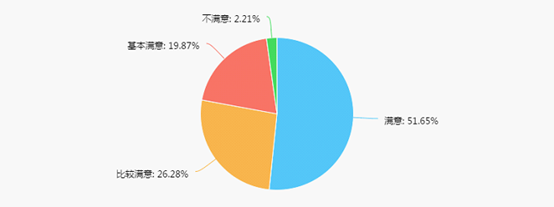 2018年毕业生对学院各项工作表示满意的占51.65%,比去年持平;比较满意的占26.28%,,基本满意的占19.87%,不满意的占2.21%。