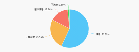 有56.89%的毕业生对我院教学工作的整体水平表示满意,较去年上升5个百分点;25.55%的毕业生表示比较满意,15.96%的毕业生表示基本满意,1.59%的毕业生表示不满意。