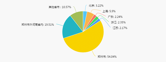 2018年毕业生在郑州市工作的占到了54.04%,较2017年上升了4个百分点。在京广沪江浙一带工作学生比例为15.88%,较17年下降2个百分点。郑州市外河南省内的为19.51%,较17年下降了3个百分点。其它省市10.57%,较17年上升1个百分点。