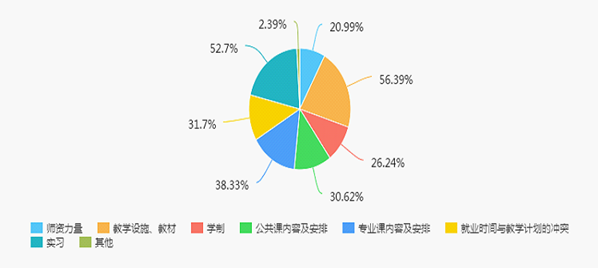 毕业生认为学院最值得研讨和改进的工作是教学设施、教材,其次是实习、专业课内容及安排。