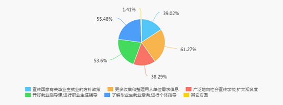 毕业生认为就业指导工作中应着重加强收集和整理社会上有关人才需求的信息,以及开好就业指导课进行职业生涯辅导和了解毕业生就业意向进行个体指导。