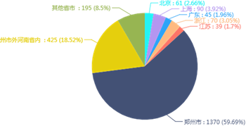 2019年毕业生在郑州市工作的占到了59.69%,较2018年上升了5个百分点。在京广沪江浙一带工作学生比例为13.29%,较18年下降2个百分点。郑州市外河南省内的为18.52%,较17年下降了1个百分点。其它省市8.50%,较18年下降了2个百分点。