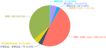 47.32%毕业生在民营(私营)企业工作,较18年下降了20个百分点;在国家机关事业单位及国有企业工作的占8.67,较18年下降了3个百分点;在外资合资企业工作和自有企业工作的比例与去年持平;其他类占36.51 %,较18年上升了23个百分点。