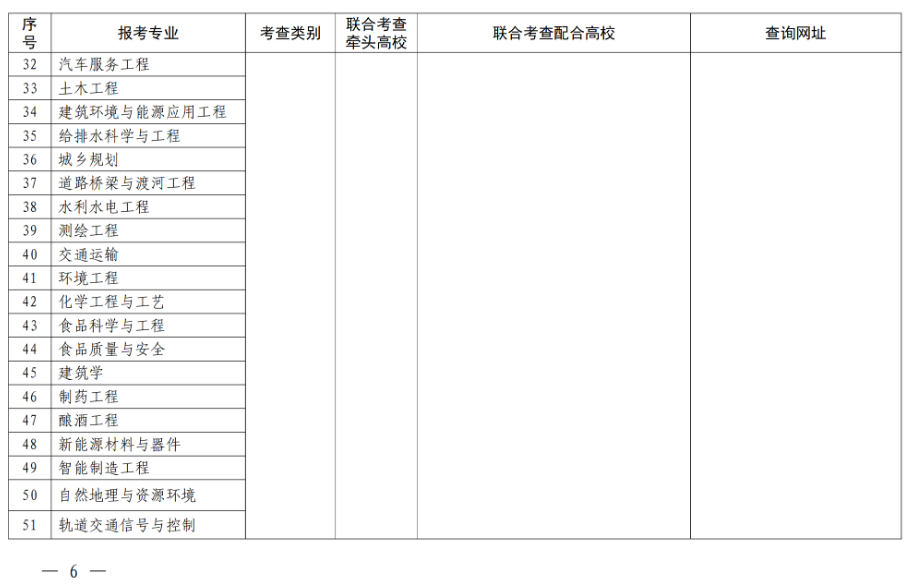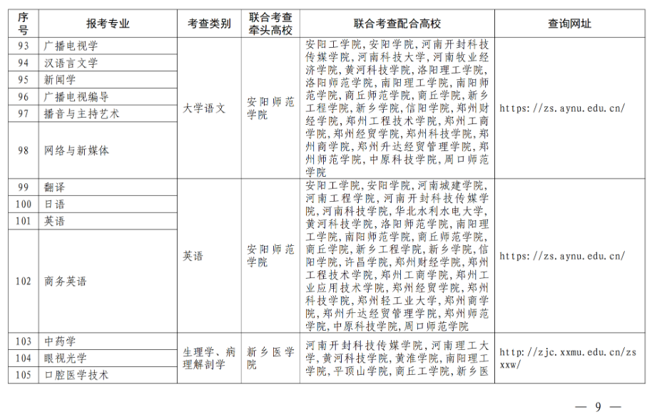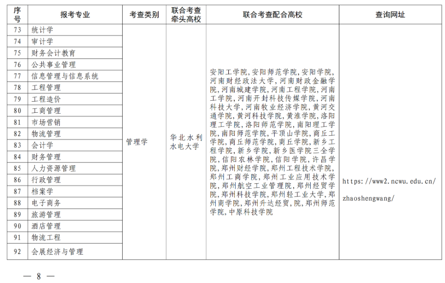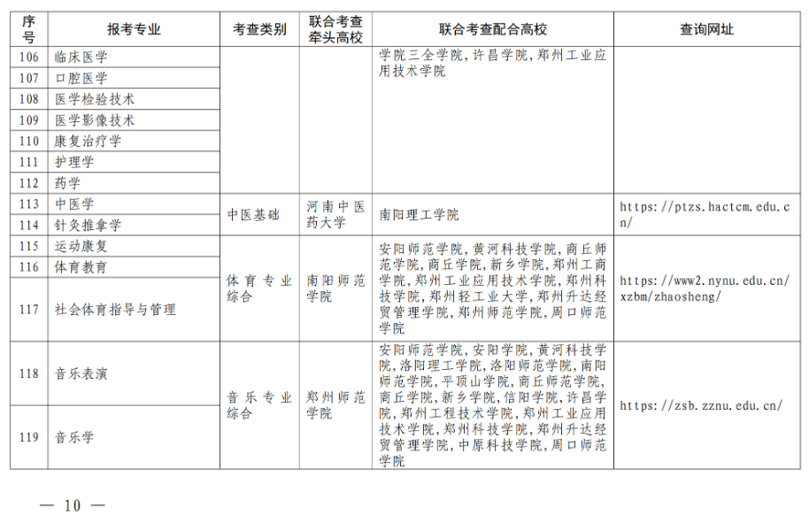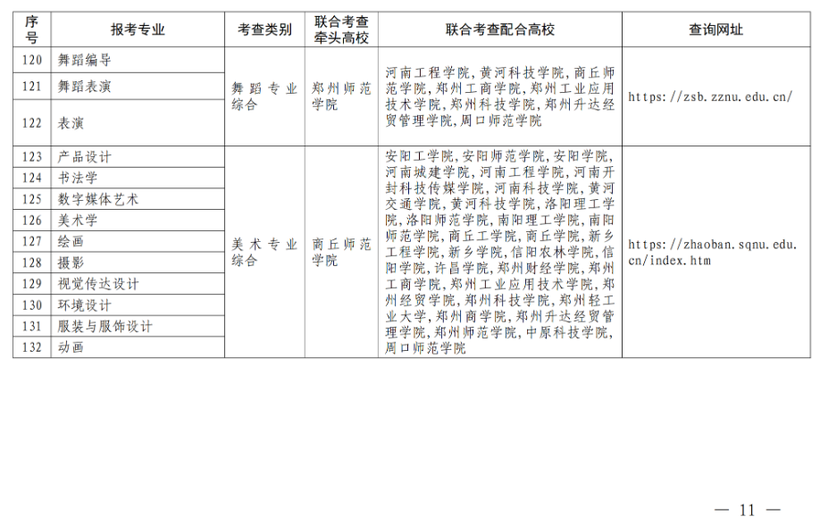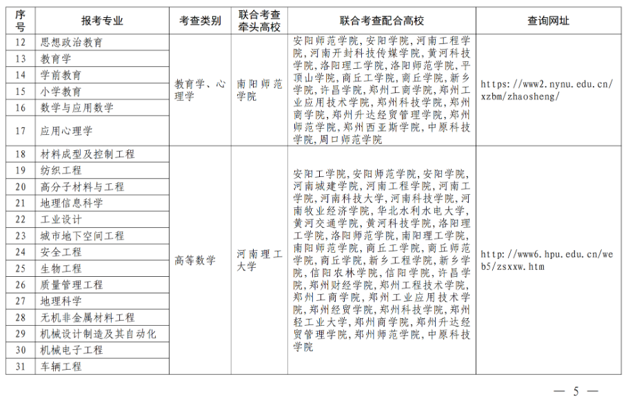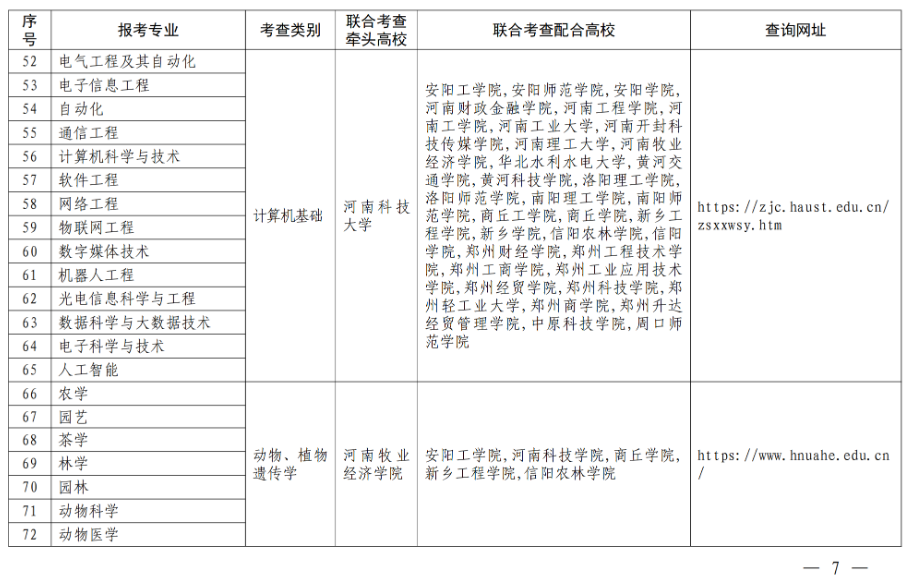 二、合理制定联考方案。各联合考查组要根据本专业大类培养目标和对考生能力的要求,结合报考情况,合理制定联合考查方案,明确高校考查时间、考查地点、考查方式、录取规则、联系电话、网址等事项。各牵头高校要于3月6日前将联合考查方案上传至“河南省普通高校招生章程核定系统”(网址:http://zszcba.haedu.gov.cn)进行核定,3月20日前向社会公布。考生可登录附表中的相关网址进行查询。