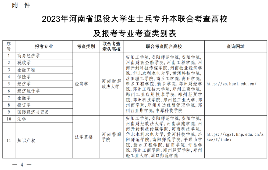 根据《河南省教育厅 河南省退役军人事务厅关于做好2023年普通高等学校专升本考试招生工作的通知》(教学〔2023〕382号)精神,为扎实做好我省退役大学生士兵免试专升本招生工作,经研究,现将2023年河南省退役大学生士兵免试专升本联合考查高校名单及报考专业考查类别等信息予以公布(见附件),并提出如下要求,请严格执行。