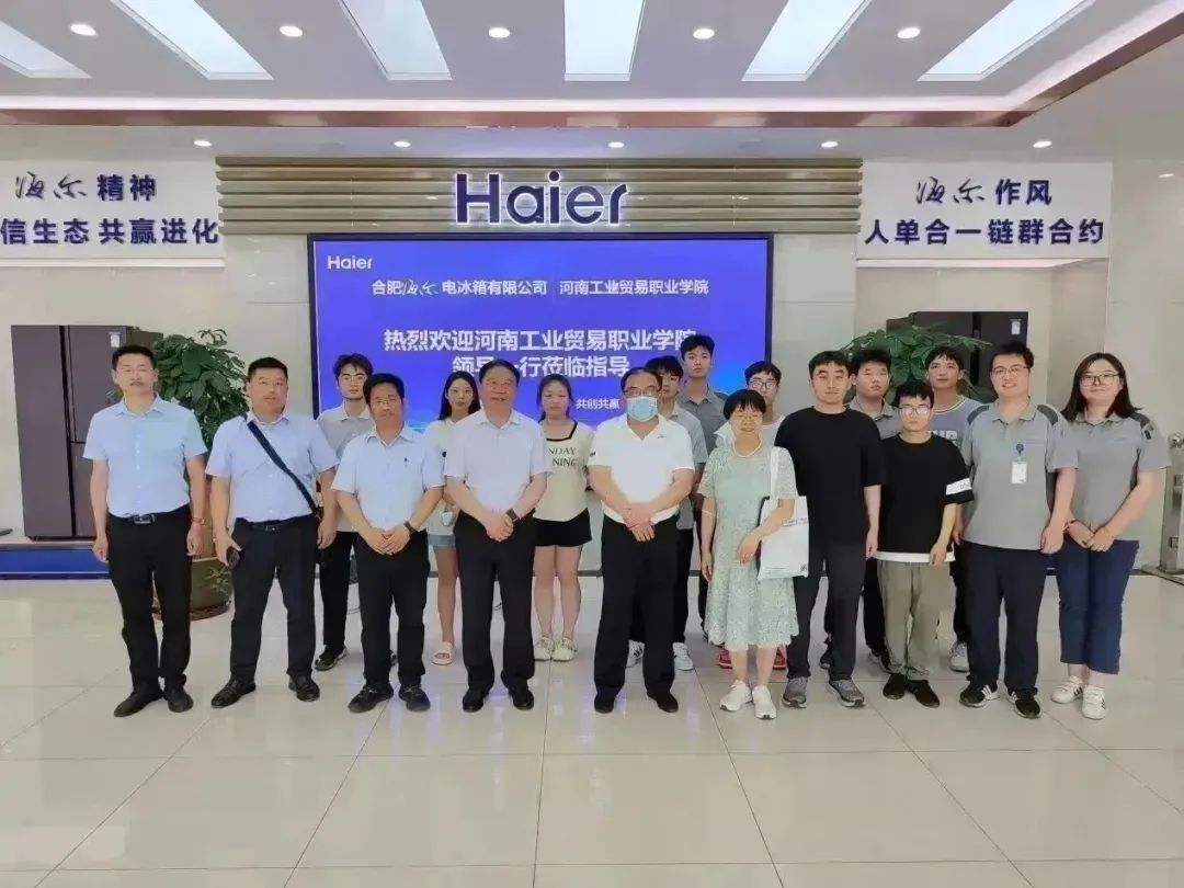 在合肥海尔电冰箱有限公司,刘合行一行亲切看望我校机电类专业实习学生,该公司副总经理赵智斌、生产部长王元、创客中心人资部经理储贻成等陪同参观座谈。企业对学生在实习岗位上的表现给予高度评价。会谈中就进一步发挥我校同合肥海尔基地间相关专业高质量发展达成共识,今后将在产教融合、校企合作方面进一步明确细化再落实。