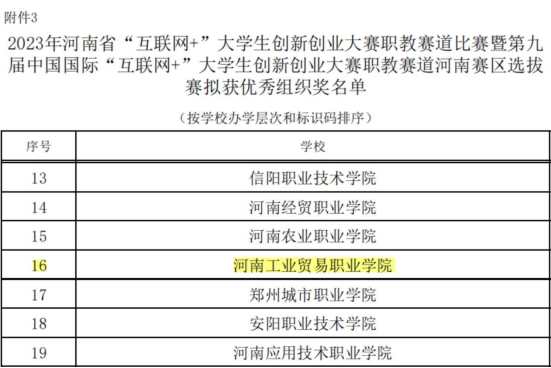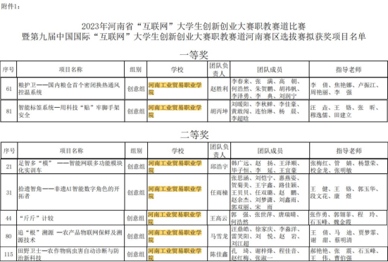 8月3日,2023年河南省“互联网+”大学生创新创业大赛暨第九届中国国际“互联网+”大学生创新创业大赛职教赛道河南赛区选拔赛圆满落幕,我校选手取得一等奖2个、二等奖5个、三等奖8个的优异成绩,并再次荣获优秀组织奖;李倩、汪垚等10名教师荣获“优秀创新创业指导老师”荣誉称号。