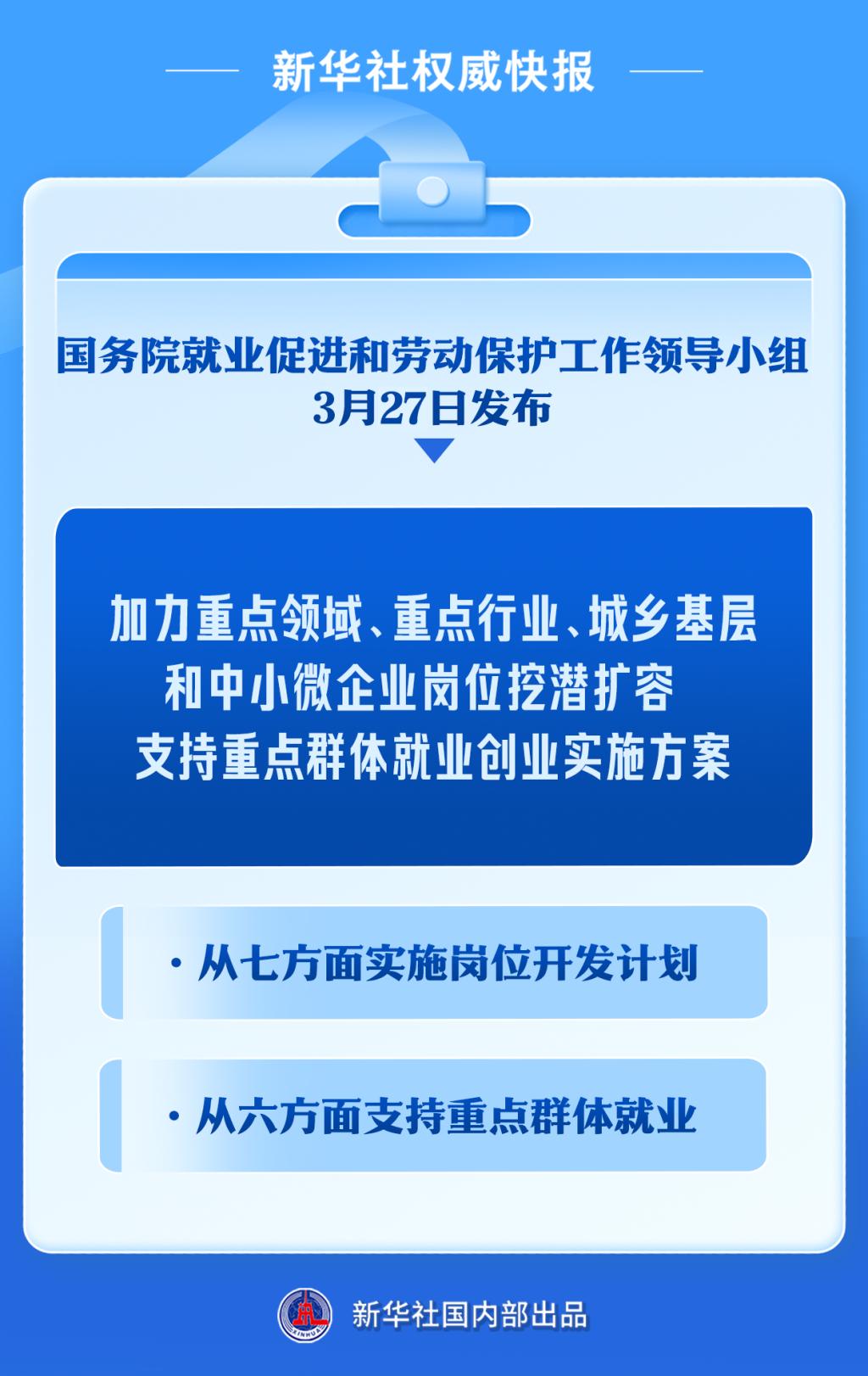 国务院就业促进和劳动保护工作领导小组3月27日发布《加力重点领域、重点行业、城乡基层和中小微企业岗位挖潜扩容 支持重点群体就业创业实施方案》。