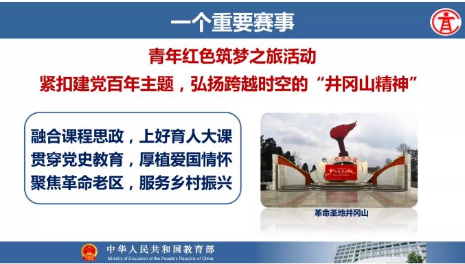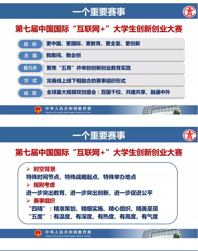 2021年4月1日,“2021年全国高教处长会”在陕西西安召开,教育部高教司司长吴岩在《夯实教学“新基建” 托起培养高质量》主题报告中指出要办好第七届中国国际“互联网+”大学生创新创业大赛,凸显大赛更国际、更全面、更创新、更中国、更教育的“五更”办赛目标。以“我敢闯,我会创”为大赛主题,聚焦“五育”并举的创新创业教育实践,完善线上线下相融合的赛事组织形式,办一场全球最大规模双创盛会。关于青年红色筑梦之旅活动,要紧扣建党百年主题,弘扬跨越时空的“井冈山精神”。