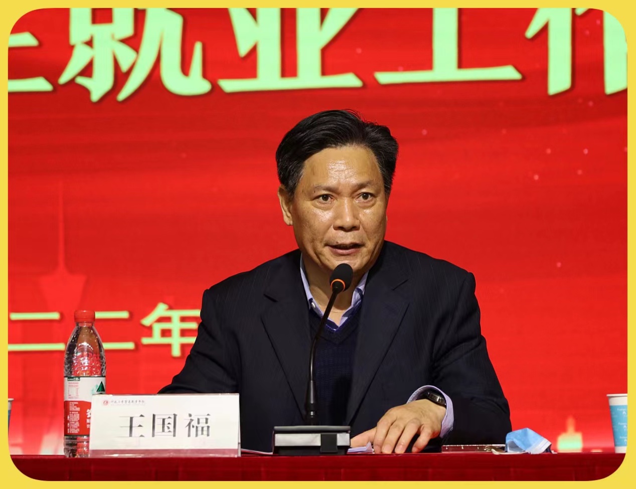 王国福校长对我校2021年招生就业工作进行了全面总结回顾,并对2022年招生就业工作做了动员部署。他指出:2021年对学校来说,是不平凡的一年、是拼搏的一年、奋斗第一年、硕果丰厚的一年。我校招生就业工作紧跟学校跨越式发展步伐,录取人数达8293人,报到7959人,年终就业率达97.11%,两项指标再创学校历史新高,圆满完成年初既定目标,取得生源质量和就业质量的双提升。2021年我校全面落实全国、全省教育大会精神,抓住机遇、创新发展,招生就业工作取得“一个完善”、“两个提升”、“三个突破”、“四个坚持”的丰硕成果。