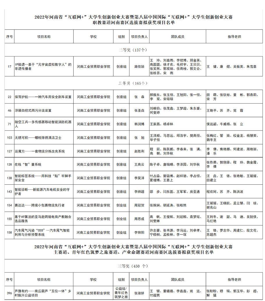 为深入贯彻教育部《关于举办第八届中国国际“互联网+”大学生创新创业大赛的通知》和《2022年河南省“互联网+”大学生创新创业大赛暨第八届中国国际“互联网+”大学生创新创业大赛河南赛区选拔赛的通知》精神,我校党委高度重视,自大赛3月份启动以来,认真筹备、精心组织、积极动员,共申报参赛项目3477个,其中职教赛道2879个、红旅赛道488个、主赛道110个,比去年增加2160个,刷新我校“互联网+”申报参赛项目历史纪录!