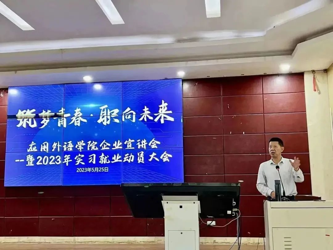 为深入贯彻党的二十大精神,落实党中央、国务院关于促进高校毕业生等青年就业决策部署和学校毕业生实习就业工作会议有关要求,进一步做实做细应用外语学院毕业生就业工作,2023年5月25日晚上6点,应用外语学院在龙湖校区3201教室召开企业宣讲会暨2023年实习就业动员大会。应用外语学院党总支书记李松奇、副院长顾佳、党总支副书记田莉莉等领导出席了本次会议。参与本场宣讲会的优秀企业有河南澳得电子商务、郑州喜来登酒店、永和铂爵酒店以及郑州航空港万怡酒店。