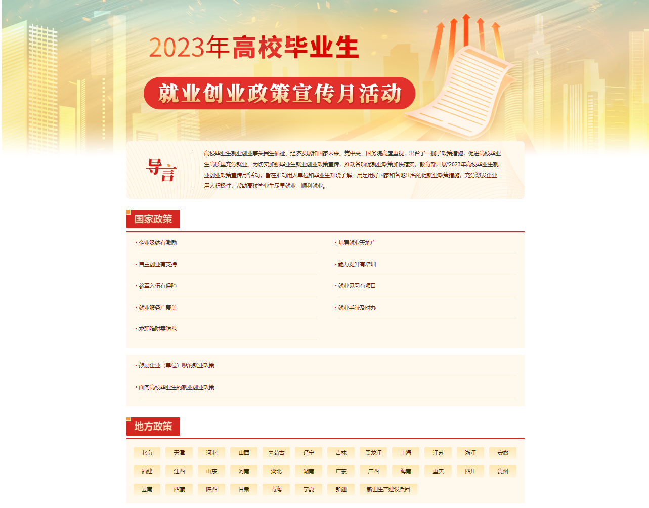 高校毕业生就业创业事关民生福祉、经济发展和国家未来。党中央、国务院高度重视,出台了一揽子政策措施,促进高校毕业生高质量充分就业。为切实加强毕业生就业创业政策宣传,推动各项促就业政策加快落实,教育部开展“2023年高校毕业生就业创业政策宣传月”活动,旨在推动用人单位和毕业生知晓了解、用足用好国家和各地出台的促就业政策措施,充分激发企业用人积极性,帮助高校毕业生尽早就业,顺利就业。https://www.ncss.cn/zchz/