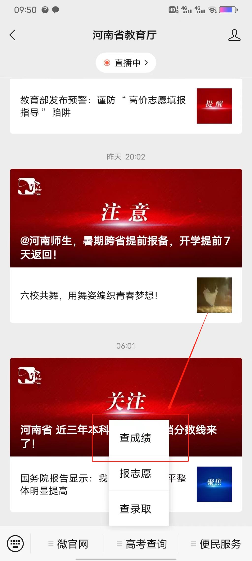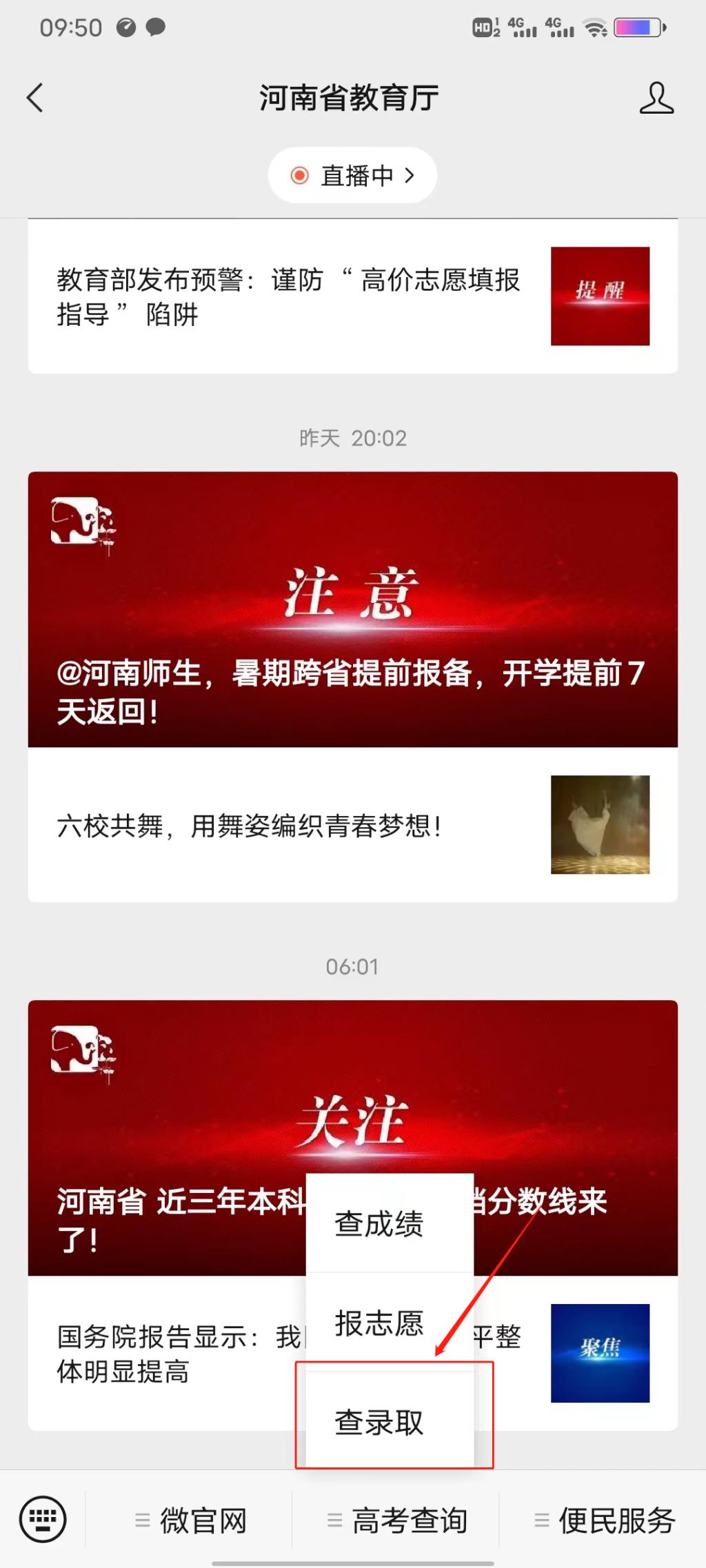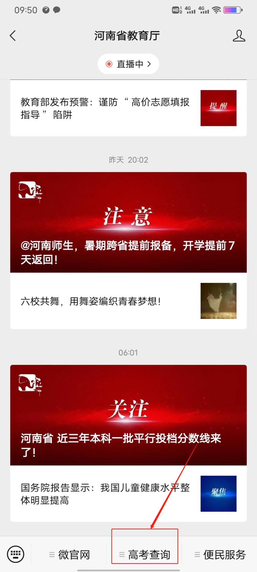通过河南省教育厅网站(http://jyt.henan.gov.cn/)、河南省教育考试院网站(http://www.haeea.cn)、河南招生考试信息网(http://www.heao.com.cn)、河南省普通高校招生考生服务平台(https://pzwb.haeea.cn/)查询。