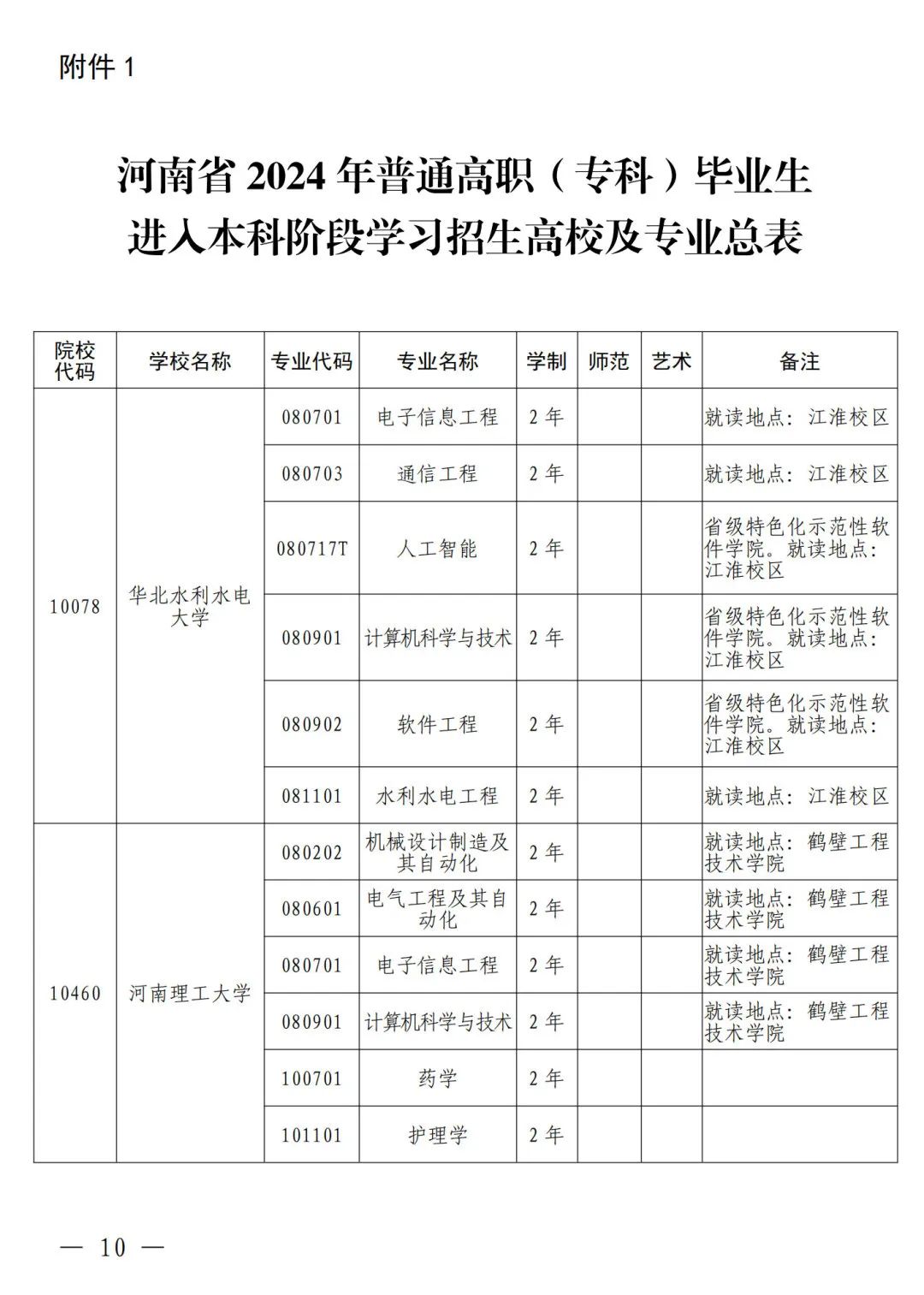 附件:1.河南省2024年普通高职(专科)毕业生进入本科阶段学习招生高校及专业总表