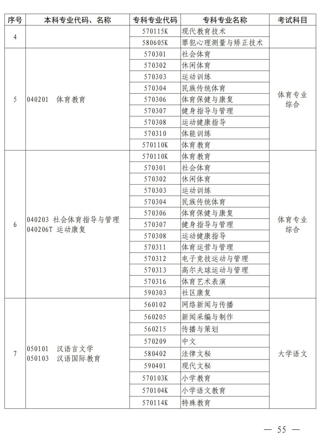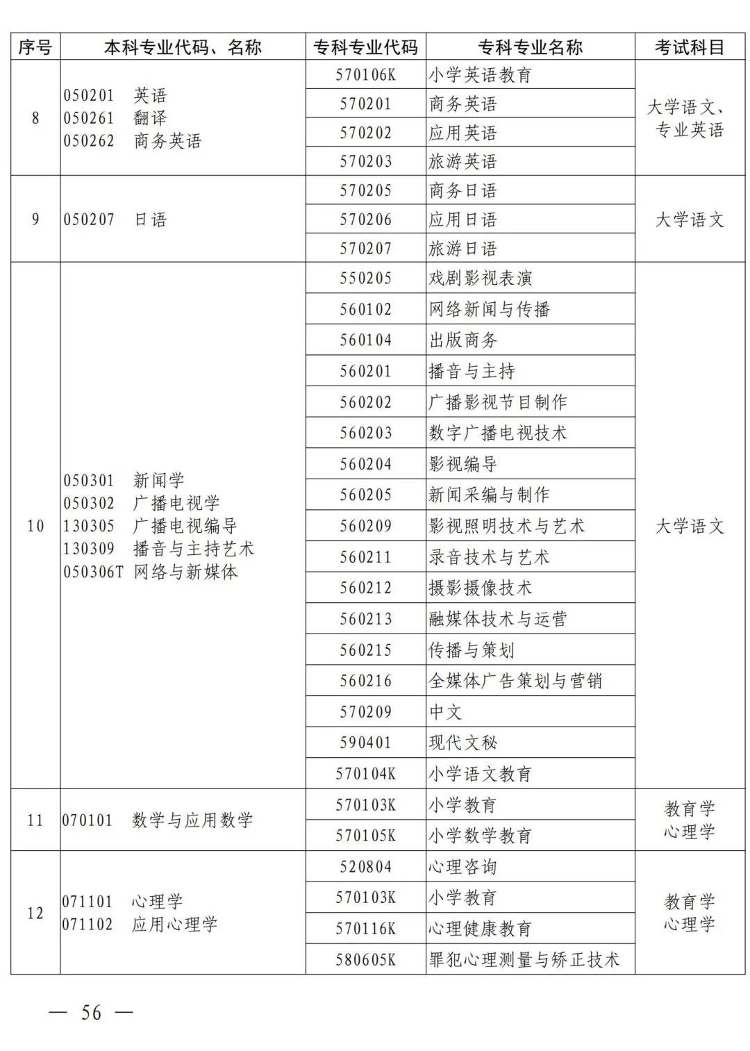 2.考试内容。考生须参加全省统一组织的专升本考试。考试科目为英语(英语专业考生为《专业英语》,非英语专业考生为《公共英语》)、专业综合(体、音、舞、美专业为专业加试)两科,每科满分为150分。专业综合考试以本科招生专业的专业课或专业基础课分类,按照《本、专科专业对照及考试课程一览表》规定的考试课程进行命题。