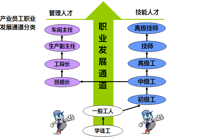 工厂为员工提供通畅的学历提升、技能等级晋升鉴定、多岗位技能培训平台,员工通过个人努力,可以逐步晋升至班长、段长、车间管理、车间主任,车间技术员、车间技术质量主任、工厂其他技术岗位。