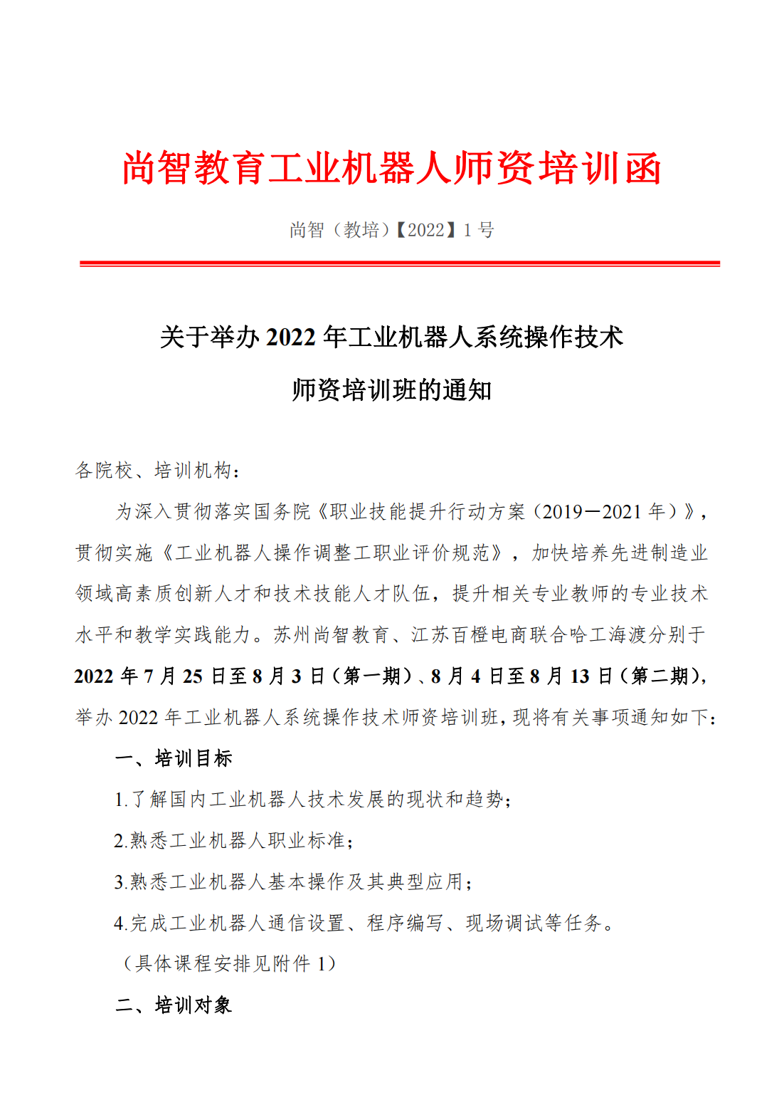 【培训】尚智教育工业机器人师资培训函