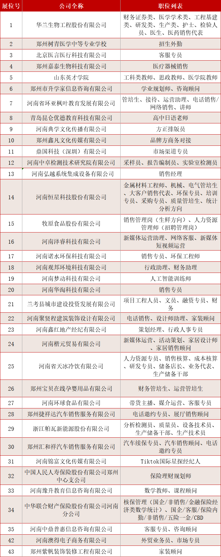截至目前,已有华兰生物工程股份有限公司、河南恒星科技股份有限公司、牧原食品股份有限公司、浙江帕瓦新能源股份有限公司、兰考县城市建设投资发展有限公司、山东英才学院、郑州树青医学中等专业学校等近40家国有企业、上市公司和知名企业参会,提供岗位2000余个。