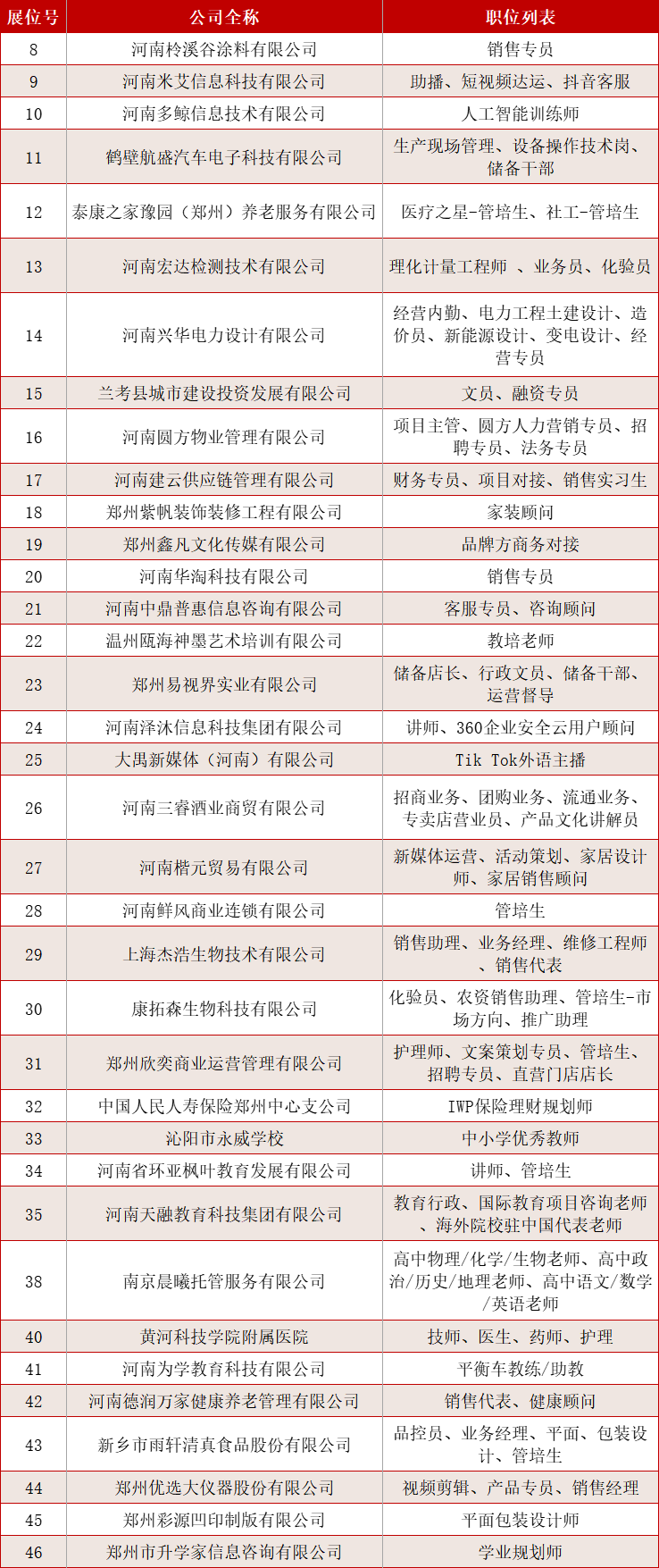 截至目前有兰考县城市建设投资发展有限公司、中国人寿郑州中心支公司、黄河科技学院附属医院、河南圆方物业管理有限公司、河南兴华电力设计有限公司等近40家国有企业和知名企业参会,提供岗位近2000个。企业持续报名中。