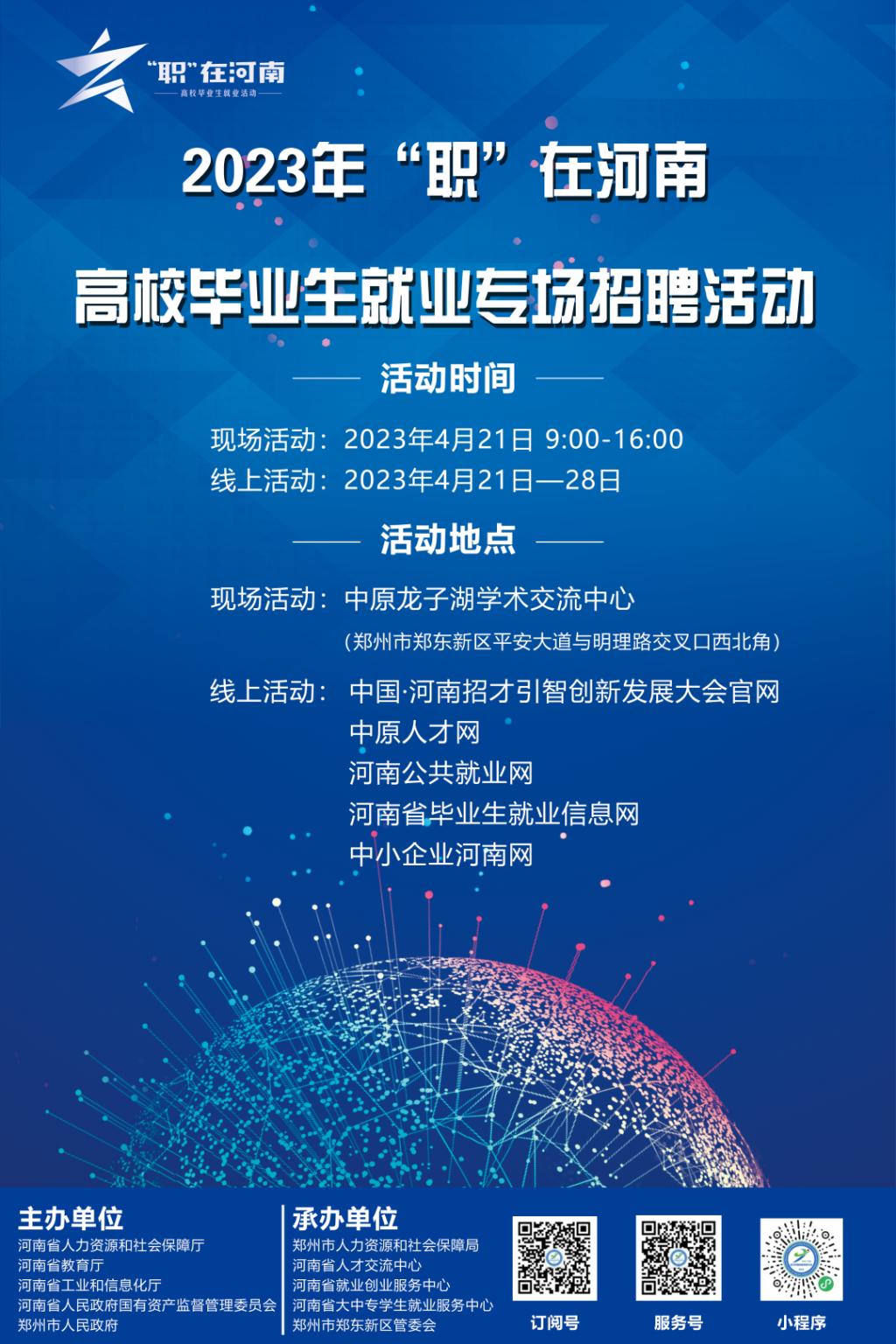 为深入学习贯彻党的二十大精神,全面落实党中央、国务院和省委、省政府关于高校毕业生就业创业工作的决策部署,促进高校毕业生高质量充分就业,省人社厅联合省教育厅、省工信厅、省政府国资委、郑州市政府共同举办的“2023年‘职’在河南——高校毕业生就业专场招聘活动”,将于4月21日在中原龙子湖学术交流中心启动。