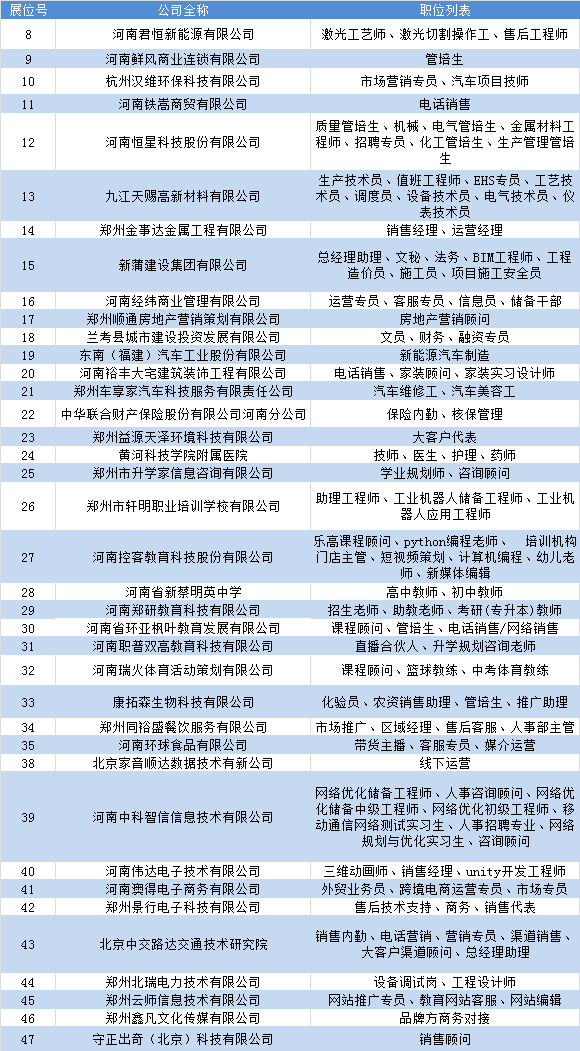 截至目前,有九江天赐高新材料有限公司、河南中科智信信息技术有限公司、新蒲建设集团有限公司、郑州车享家汽车科技服务有限责任公司、兰考县城市建设投资发展有限公司、郑州车享家汽车科技服务有限责任公司、北京中交路达交通技术研究院、河南省新蔡明英中学等近40家国有企业、教育机构和知名企业参会,提供岗位近2000个。用人单位持续报名中。
