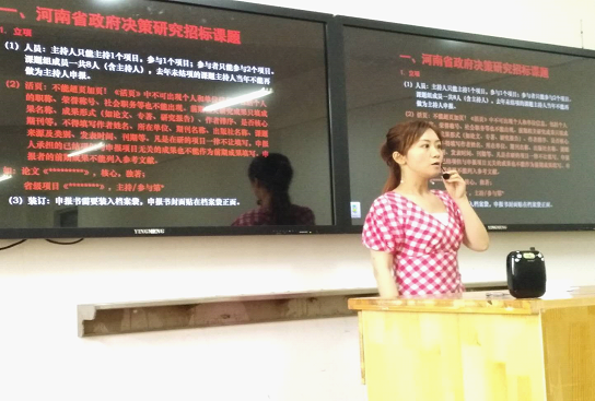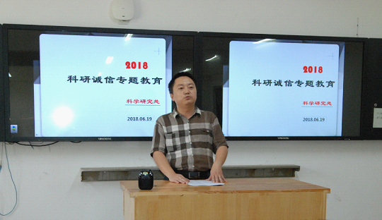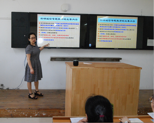 6月19日下午3:30,河南工业贸易职业学院科学研究处在3号教学楼3103教室举办了一场针对教科研人员的科研诚信教育活动。该活动举办的宗旨是弘扬学术正气、营造积极健康、和谐创新的学术氛围。主管学院科研工作的王铬副院长亲临活动现场并发表讲话,参加专业技术人员100余人,大家都满怀热情,收获满满。参会现场,大家共同学习了《河南工业贸易职业学院学术规范制度及学术不端行为处理办法(试行》(豫工贸院字[2018]33号);同时科学研究处的钱薇、赖巧琳、袁淑华老师还详细地向大家介绍了省职称评审文件中有关科研部分的主要内容;《学报》投稿注意事项;学院科研奖励文件;课题申报、期中管理、结项时的注意事项;科研管理云平台登记时的注意事项等。活动最后,每位参会人员都在《科研诚信承诺书》上郑重地签上了自己的名字,承诺自觉遵守学术道德,弘扬学术正气,做合格的专业技术人员。