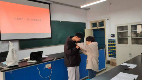并由学生党支部宣传委员范丽霞同志为林小娃同志佩戴党员徽章。