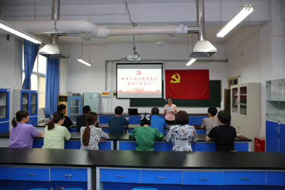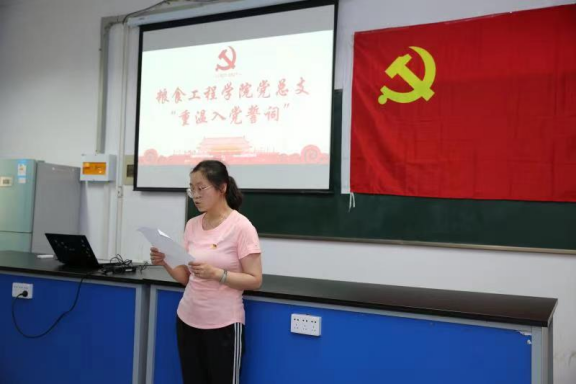 为庆祝建党100周年,进一步激励党员干部传承发扬党的光荣传统和优良作风,6月15日粮食工程学院党总支于实训楼106举行新党员入党宣誓暨重温入党誓词主题党日活动。粮食工程学院党总支郭天松书记、粮食工程学院秦长录院长、粮食工程学院卢宁副书记、粮食工程学院教职工党支部、学生党支部全体教师党员以及新发展学生党员林小娃参加活动。会议由粮食工程学院党总支卢宁副书记主持。