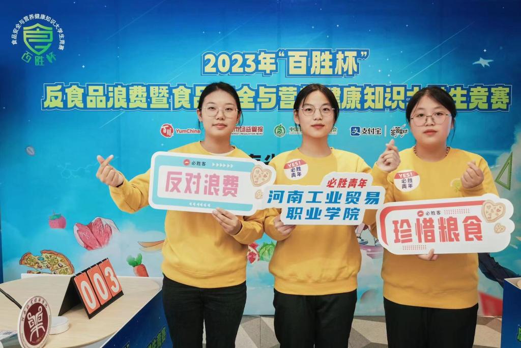 2023年11月9号,粮食工程学院学生王盼盼、刘璇、杨丽在刘艳群老师的带领下,代表河南工业贸易职业学院参加了在郑州大学举行的2023年“百胜杯”反食品浪费暨食品安全与营养健康知识大学生竞赛河南省分站赛。
