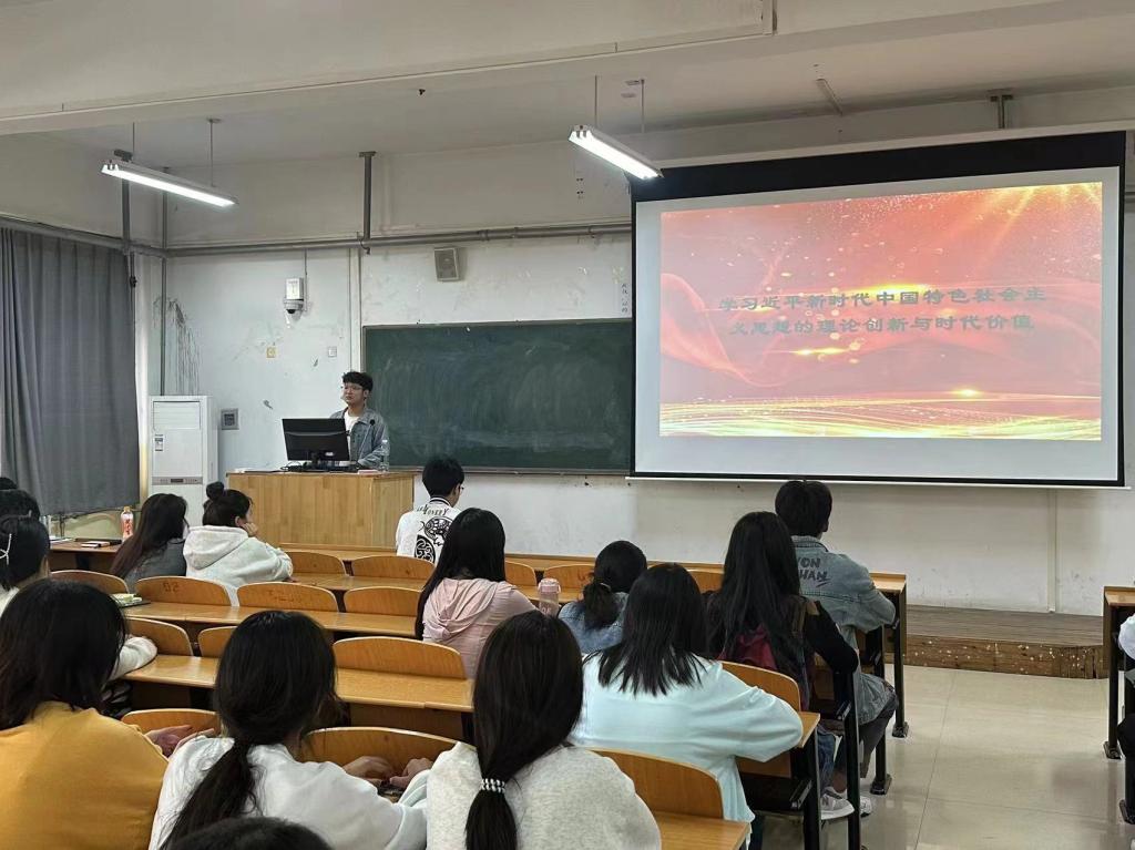 11月1日学生会主席刘家豪为学生会成员讲解“学习习近平新时代中国特色社会主义思想的理论创新与时代价值”要学习新时代中国特色社会主义思想提出一系列原创性的新理念新思想新战略,集中概括了习近平总书记关于党的建设的重要思想主要内容,深入概括新时代党的建设新的伟大工程、做好新时代的组织工作。鼓励青年们呈现自己的时代价值,做德智体美劳全面发展的社会主义建设者和接班人。
