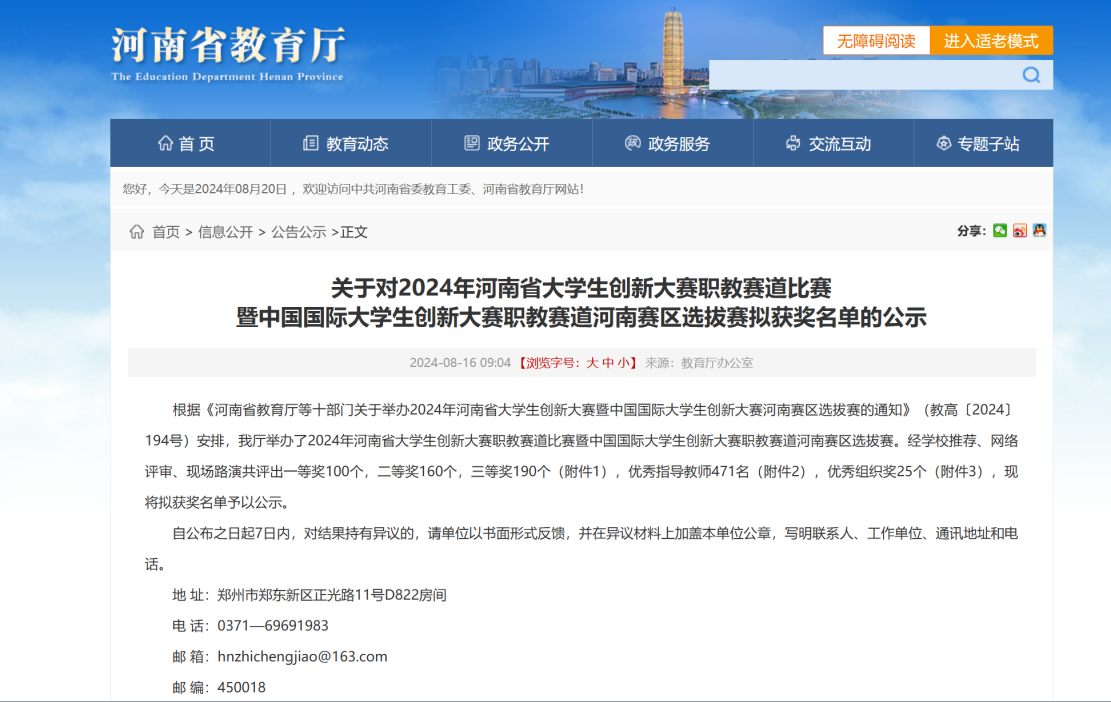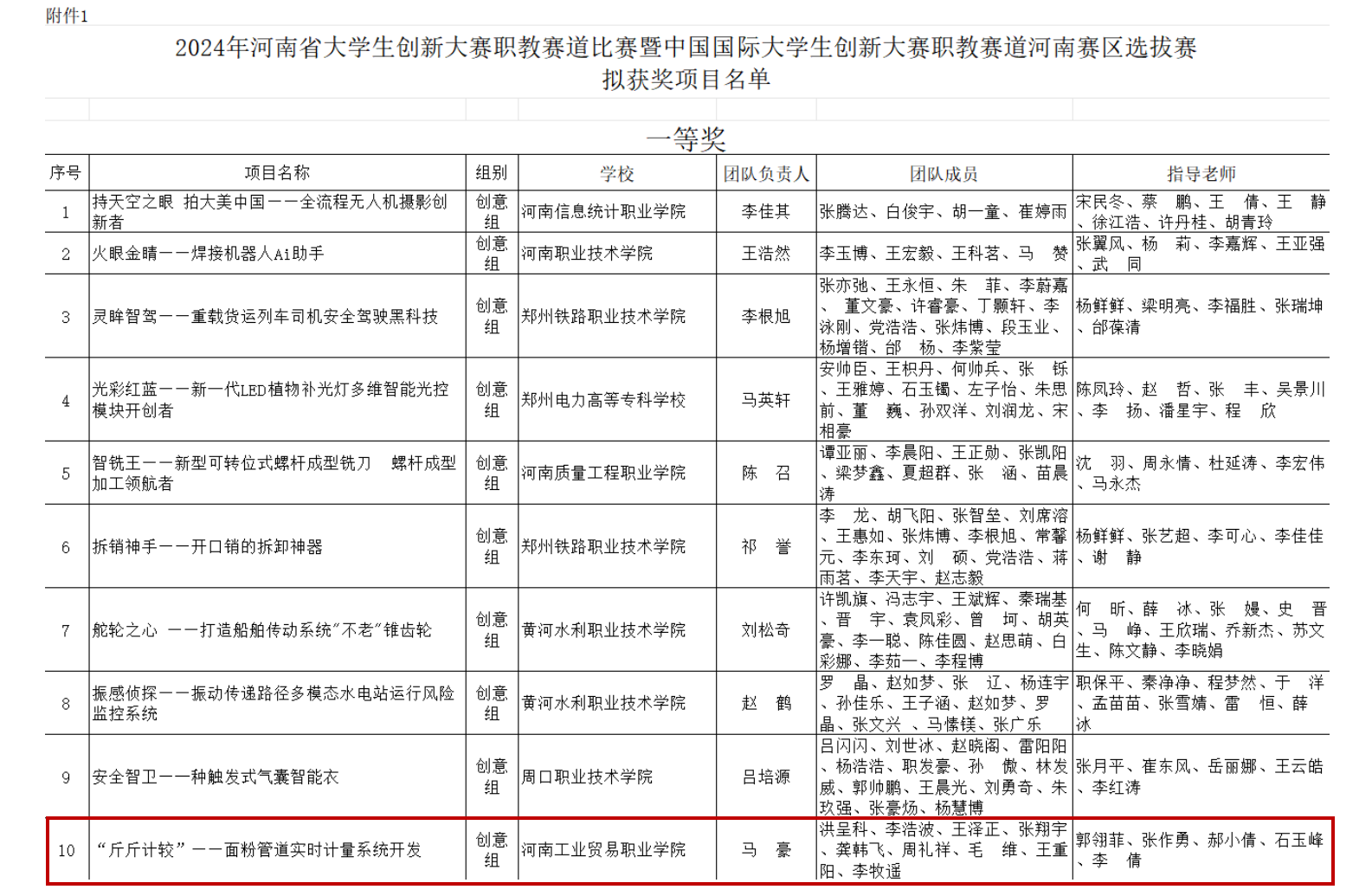 2024年7月26日-7月28日,由河南省教育厅等组织的2024年河南省大学生创新大赛职教赛道比赛暨中国国际大学生创新大赛职教赛道河南赛区选拔赛中,选手马豪、洪呈科、李浩波、王泽正、张翔宇、龚韩飞等在郭翎菲、张作勇、郝小倩等老师指导下,项目《“斤斤计较”——面粉管道实时计量系统开发》获得一等奖的好成绩。在备赛中,指导老师给予参赛选手细致的指导和帮助,参赛选手们也积极备战,最终在决赛中取得佳绩,并有望晋级国赛。
