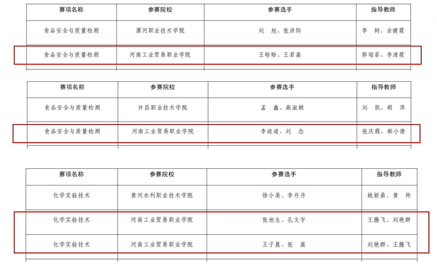 2023年11月27日-12月4日,2023年河南省高等职业教育技能大赛高职组“食品安全与质量检测”赛项和“化学实验技术”赛项分别在黄河水利职业技术学院和河南应用技术职业学院举行,我院共派出4支队伍参赛,喜获3个二等奖、1个三等奖的好成绩。选手王盼盼、王若嵩、刘念、李政道在郭翎菲、李清筱、张庆霞、郝小倩老师的指导和带领下,在高职组“食品安全与质量检测”赛项中分别获得了二等奖和三等奖。选手张旭生、孔文宇、王子晨、张嵩在刘艳群、王腾飞老师的指导和带领下,在“化学实验技术”赛项中,获得了两项二等奖的好成绩。