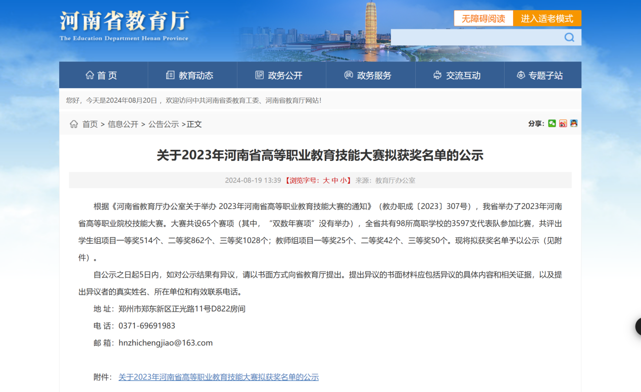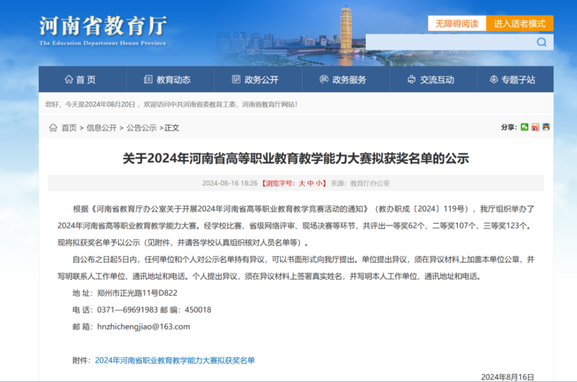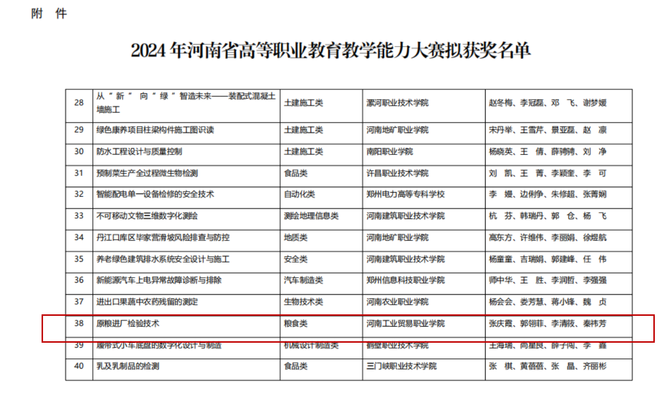 2024年6月15-6月19日,我院在河南省教育厅组织的2024年河南省高等职业教育教学能力大赛中,由张庆霞主持,郭翎菲、李清筱等参与的项目《原粮进厂检验技术》喜获二等奖。